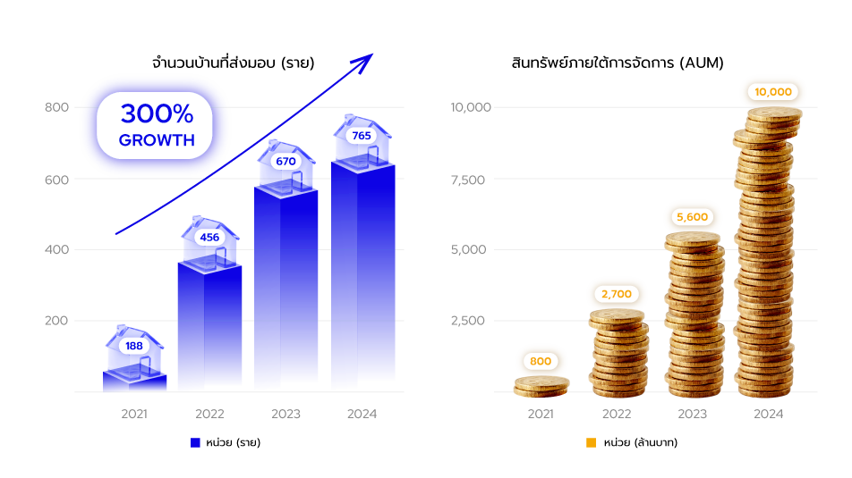 และจากกราฟจะเห็นว่า JUZMATCH มีอัตราการเติบโตของการส่งมอบบ้านเพิ่มขึ้นกว่า 300% ในระยะเวลา 4 ปี (ค.ศ.2021-2024) หรือเฉลี่ย 73% ต่อปี รวมถึงมูลค่าสินทรัพย์ภายใต้การดูแลที่เพิ่มมากขึ้นทุกปี และมูลค่าบ้านต่อหลังเฉลี่ยเพิ่มขึ้นจาก 4.25 ล้านบาท เป็น 4.8 ล้านบาท เท่ากับสูงขึ้นกว่า 209% เมื่อเทียบกับปีแรก หรือเฉลี่ย 45% ต่อปี ความสำเร็จนี้สะท้อนถึงความโดดเด่นของโมเดล เช่าเพื่อซื้อ ที่ตอบโจทย์ความต้องการของผู้ที่อยากเป็นเจ้าของบ้านได้อย่างแท้จริง ด้วยความน่าเชื่อถือ มาตรฐานสูง ความปลอดภัย และประสบการณ์ยาวนานกว่า 5 ปี ทำให้ JUZMATCH ได้ส่งมอบบ้านให้คนไทยไปแล้วมากกว่า 2,000 หลัง ซึ่งเป็นเครื่องยืนยันว่าแนวคิดนี้สามารถแก้ปัญหาและเติมเต็มความฝันของคนไทยในการเป็นเจ้าของบ้านได้อย่างยั่งยืน