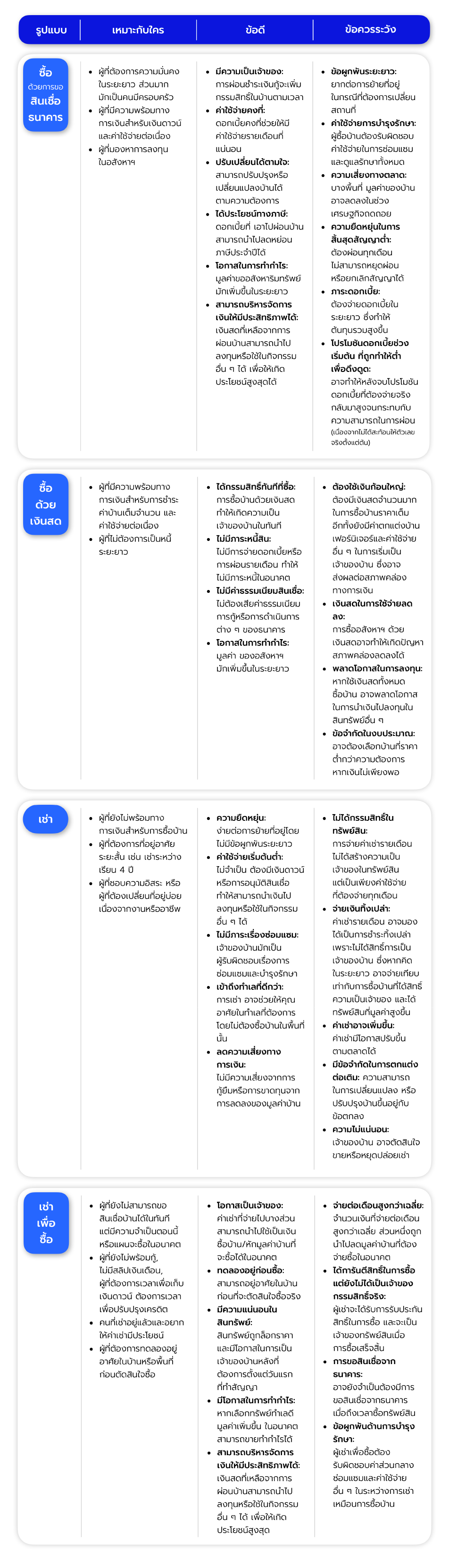 จริง ๆ แล้ว ไม่มีใครตอบคำถามนี้ได้ดีไปกว่าตัวคุณเอง เพราะบริบท เงื่อนไข ความจำเป็นในชีวิต จังหวะชีวิตของแต่ละบุคคลไม่เหมือนกัน มาดูกันว่า...ซื้อ เช่า หรือเช่าเพื่อซื้อมีข้อดี ข้อควรระวังอย่างไร และแบบไหนเหมาะกับคุณ